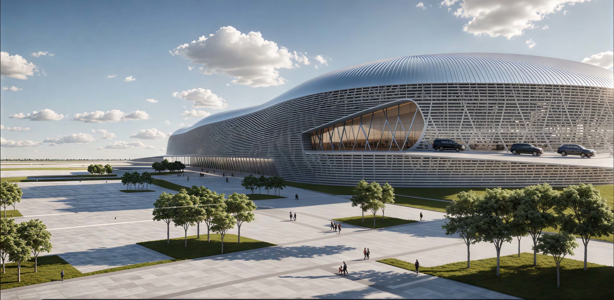 L’architettura aeroportuale è composta da due strutture distinte; Un primo involucro racchiude la pianta su due livelli atta ad assolvere correttamente a tutte le funzioni di un moderno aeroporto, lo spazio è scandito da strutture a vista portanti; in modo ritmico cle grandi pareti in cristallo delimitano il perimetro e divengono al tempo stesso la pelle sensibile e trasparente dell’intero involucro. Una seconda struttura a brise-soleil avvolge la prima ed oltre a essere indispensabile dal punto di vista bioclimatico, da all’intera architettura una forma morbida e rarefatta riferibile alla natura. Il colore predominante della struttura esterna è il bianco, atto a frenare l’intenso calore portato dai raggi solari e migliorando i consumi energetici nei periodi caldi, nel contempo restituisce la luce e donando all’intera architettura una caratteristica mediterranea e moderna.I NTERNI l’interno risponde alle migliori tecniche progettuali e l’intento è quello di rendere l’ambiente di immediata lettura con un’identità unica e riconoscibile. Il progetto dei materiali e del colore sono studiati per rendere la permanenza nella zona aeroportuale un’esperienza positiva e memorabile.